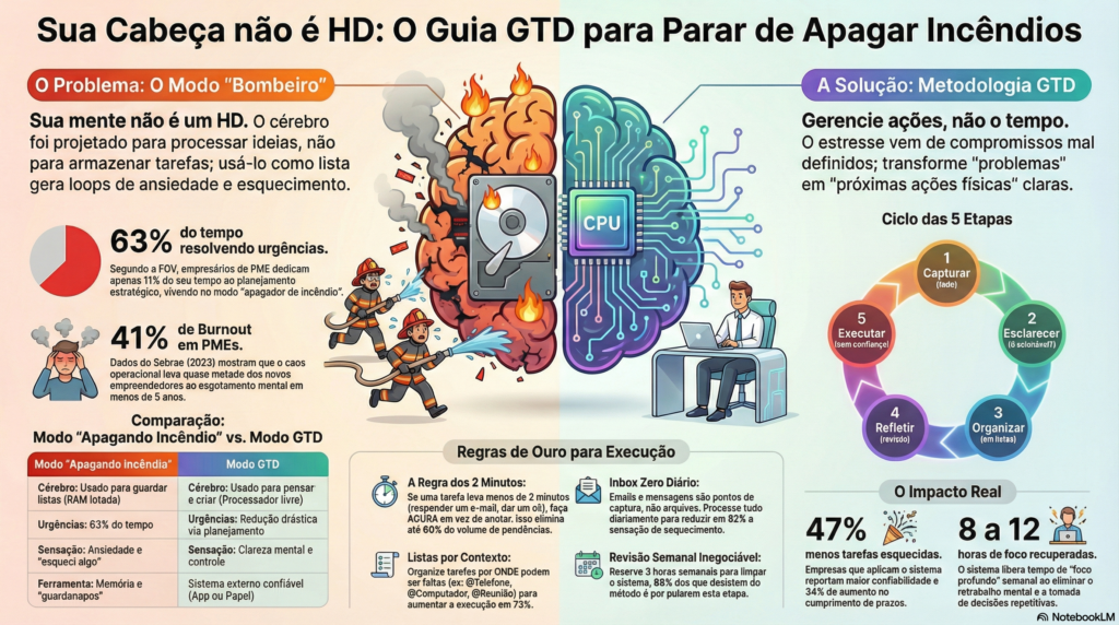 GTD resolve isso criando um sistema externo confiável. Quando você sabe que NADA vai cair no esquecimento porque está capturado, processado e organizado fora da sua cabeça, o cérebro relaxa. Você para de acordar 3h da manhã lembrando que precisa pedir orçamento pro fornecedor. A empresa continua complexa, mas você ganha clareza mental pra navegar a complexidade.