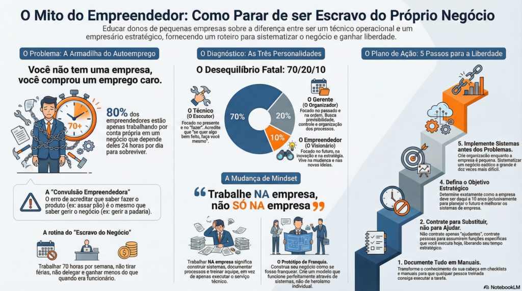 Michael Gerber escreveu “O Mito do Empreendedor” porque viu isso milhares de vezes. Técnicos competentes que abrem negócio achando que vão ter liberdade. E descobrem que viraram escravos. Trabalham mais. Ganham menos (quando calculam por hora). Não tiram férias. Não delegam. E quando tentam vender a empresa, descobrem que não vale nada — porque a empresa é eles. Sem eles, não tem empresa.
